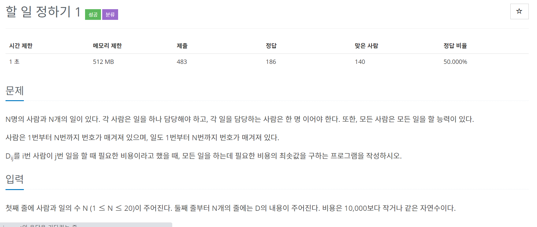N명의 사람과 N개의 일이 있다. 각 사람은 일을 하나 담당해야 하고, 각 일을 담당하는 사람은 한 명 이어야 한다. 또한, 모든 사람은 모든 일을 할 능력이 있다. 사람은 1번부터 N번까지 번호가 매
