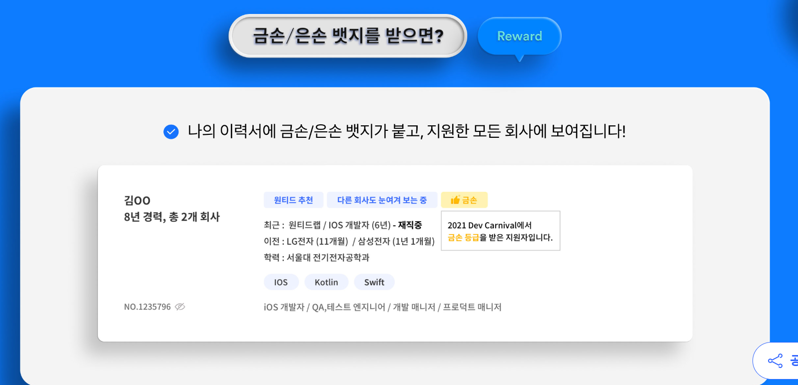 원티드가 추천하는 18개 기업에 당신의 코드를 보여주세요! SHOW ME THE CODE 코딩테스트 결과, 일정 점수 이상 획득한 지원자는 이력서 제출 시 원티드 인증 뱃지가 지원한 회사에 노출 됩니다. 채용