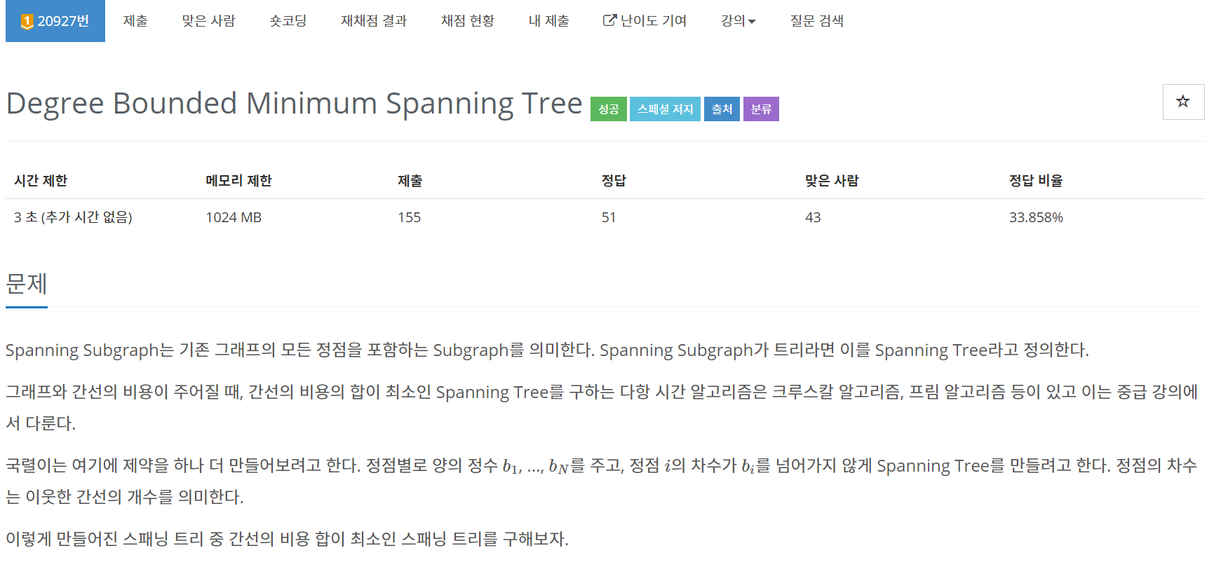 즉, 요약하자면 평범한 MST 문제이나, 차수 제한까지 포함된 MST를 만들어보란 소리이다.