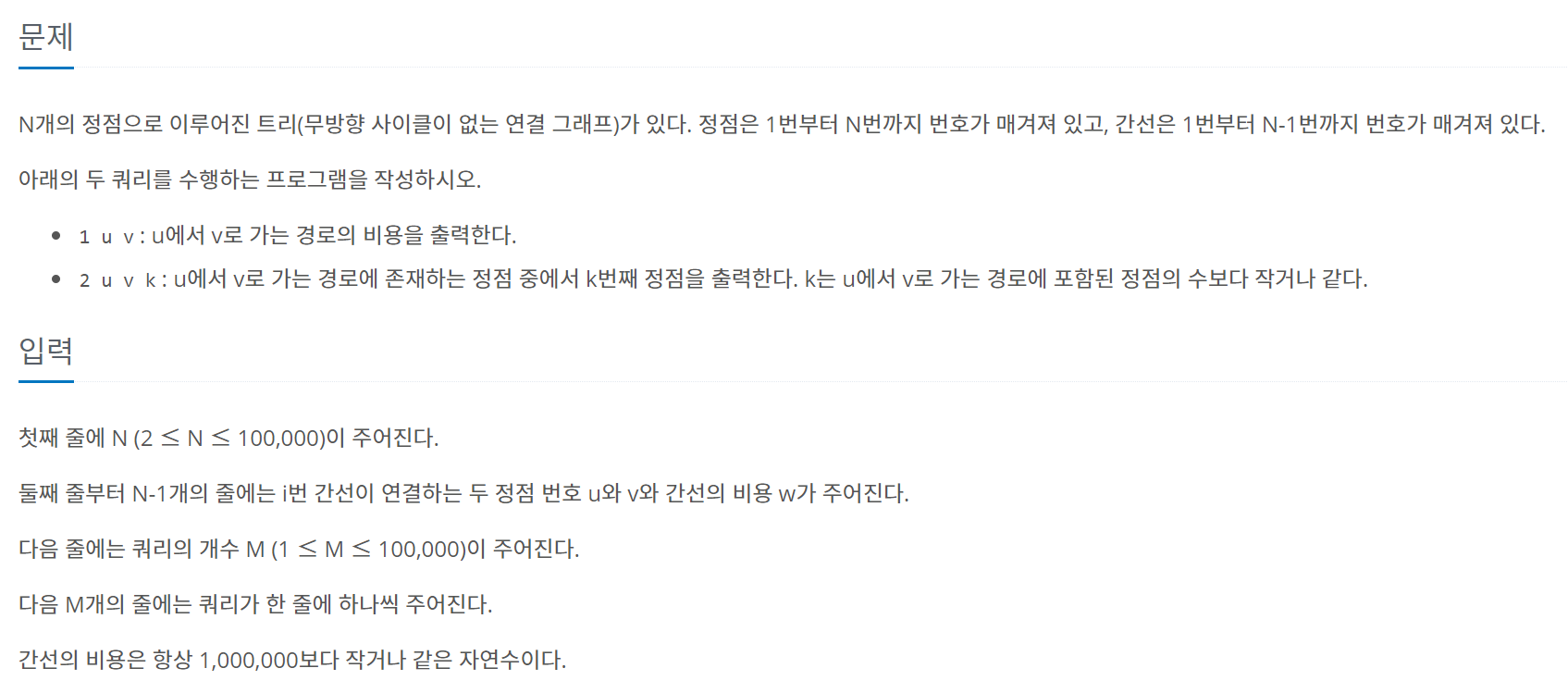1번 쿼리에서 막혔다면 아래 문제로 더 공부해보고 오자. 1번 쿼리만 있는 LCA 문제이다.