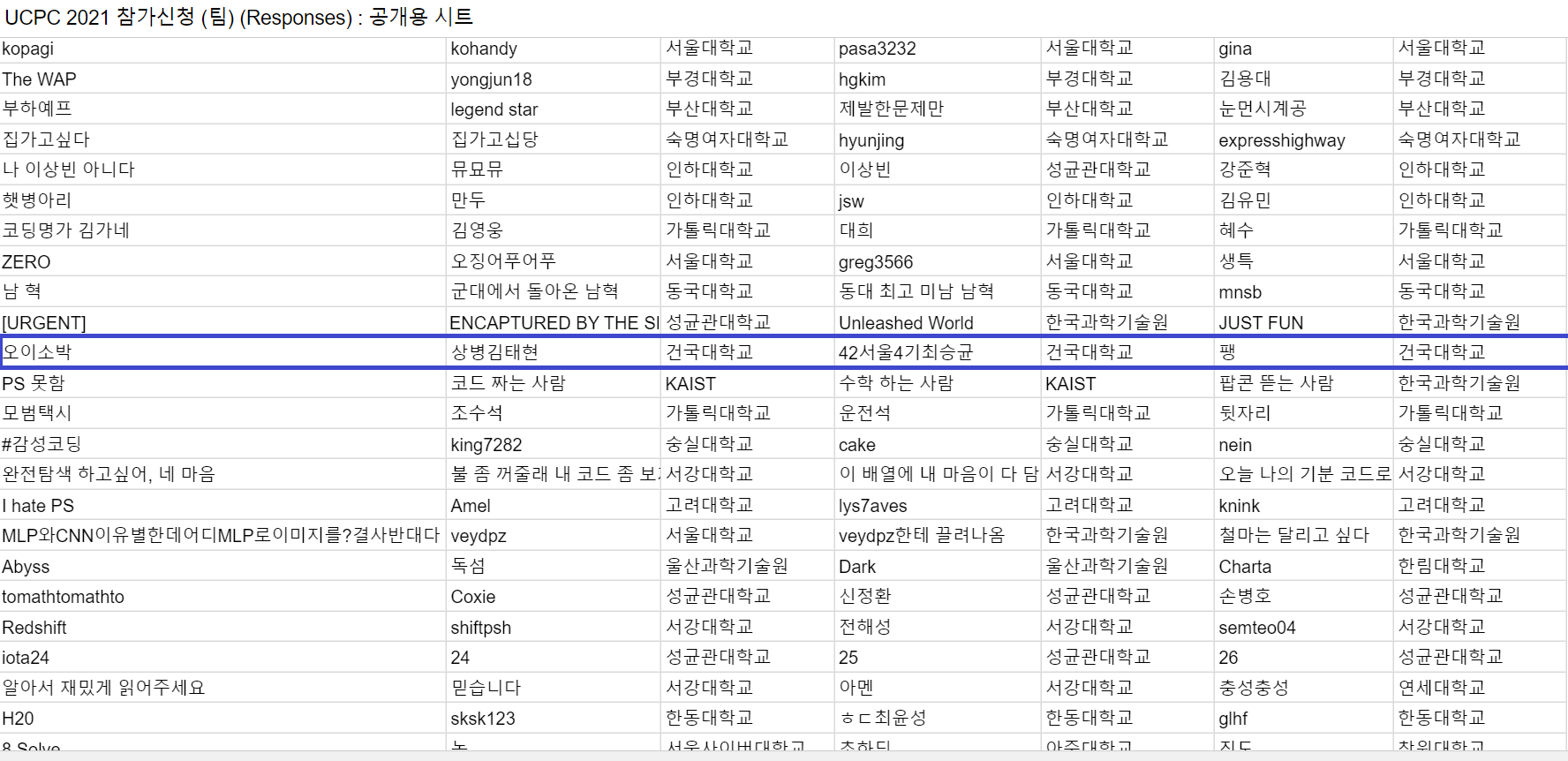 2018년, 2019년, 2020년에 비해 이번년도에는 건국대 팀이 많이 없었다. (UCPC 참여인원 중 건국대학교 소속인 사람은 우리 팀 포함 총 4명뿐이었다.)